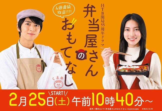 2月25日(土)午前10時40分から4週連続放送が始まる、HTB開局55周年ドラマ「弁当屋さんのおもてなし」は、シリーズ累計30万部(文庫・コミックスの紙・電子含む)を超える、札幌が舞台の人気グルメ小説「弁当屋さんのおもてなし」の待望の実写化ドラマ。札幌の路地裏にひっそりと佇む弁当屋“くま弁”で、傷心のまま東京から北海道札幌市へ転勤してきたOLの小鹿千春が、内なる願いを叶える“魔法のお弁当”の作り手・大上ユウと出会うところから物語は始まる。千春が頼んだのは「ザンギ弁当」だったのに、なぜかユウが作ったのは「鮭かま弁当」。しかしこの弁当で心も体も元気を取り戻した千春は、ユウとともに、おいしいお弁当と小さなお節介で、“くま弁”を訪れるいろいろな想いや問題を抱えた客たちを癒やしていく。