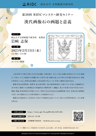 今回、 2023年2月15日(水)にオンライン開催した第20回RIDCマンスリー研究セミナー「漢代画像石の画題と意義」(スピーカー:岡山大学文明動態学研究所 岩崎志保 准教授)の録画配信を2月16日に開始しました。ぜひ皆様にご視聴頂けますと幸いです。