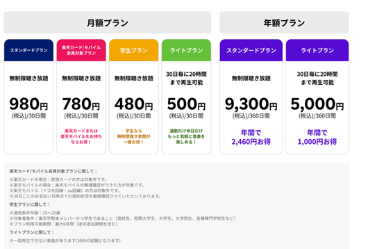 楽天グループ株式会社が運営する定額制の音楽聴き放題サービスです。iOSおよびAndroid(TM)アプリで展開しており、約1億曲の楽曲を提供しています(2022年10月時点)。ユーザーのニーズに合った様々な料金プランを提供しています。