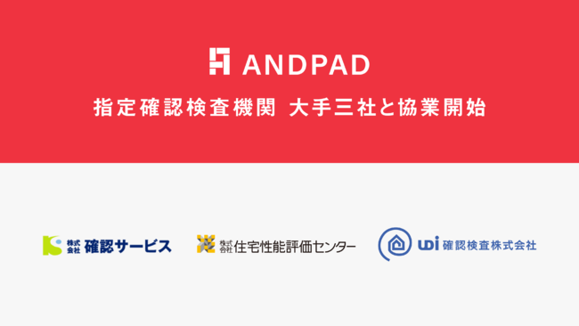 クラウド型建設プロジェクト管理サービス「ANDPAD」を運営する株式会社アンドパッド(本社:東京都千代田区、代表取締役:稲田武夫、以下アンドパッド)は、指定確認検査機関である株式会社 確認サービス(本社:愛知県名古屋市、代表取締役社長:畑中重人、以下確認サービス)、株式会社 住宅性能評価センター(本社:東京都新宿区、代表取締役 吉川到、以下住宅性能評価センター)、ユーディーアイ確認検査株式会社(本店:千葉県柏市、代表取締役:鈴木 徹、以下UDi)3社(※五十音順)との協業を発表、建築確認・住宅性能評価の進捗管理における生産性の向上をはかります。