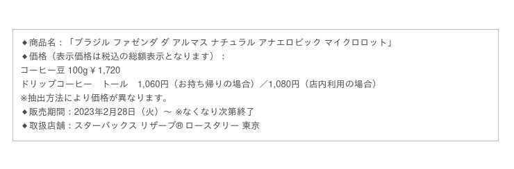 スターバックス コーヒー ジャパン 株式会社[本社所在地:東京都品川区、代表取締役最高経営責任者(CEO):水口 貴文)]は、スターバックス リザーブ(R) ロースタリー 東京(以下、ロースタリー 東京)のオープン4周年を記念し、2023年2月28日(火)に全世界のスターバックスで初めて、アナエロビック※(嫌気性)発酵という特別な方法を使って加工された、まるでシェリー酒を思わせる芳醇な風味のコーヒー『ブラジル ファゼンダ ダ アルマス ナチュラル アナエロビック マイクロロット』や、イラストレーターSHOGO SEKINE氏とのコラボレーショングッズを販売いたします。