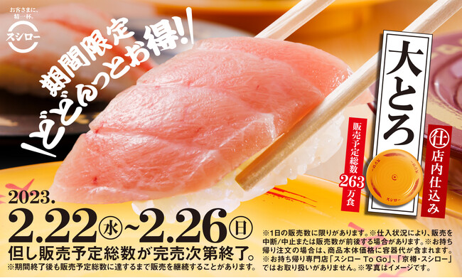 株式会社あきんどスシロー(本社:大阪府吹田市、代表取締役社長:新居 耕平)は、2月22日(水)から26日(日)の5日間限定で、全国のスシローにて「大とろ」を一番お手頃な黄皿でご提供いたします。