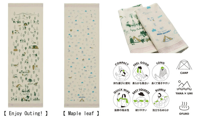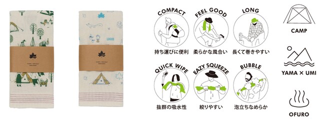 速乾性、通気性と吸水性の両立を実現した機能性抜群の「タオルてぬぐい」2種を、タウンユースやアウトドアライフで、ぜひともご活用ください。