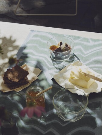 また、サウナの最中に使えるバスローブやタオル、そしてイケアで初めての販売となるサウナバケツから、サウナ体験の前後にお使いいただきたい軽食を楽しむためのトレイやグラス、床の上でくつろげるフロアクッションなどのアイテムをそろえました。さらに、北欧の家具デザインをヒントにした、クラシックでシンプルなサイドテーブルの上には、「BASTUA/バストゥア トレイ」がぴったりフィットします。ルバーブの葉の柄、形をしたトレイとガラス製品を組み合わせれば、毎日のおやつタイムに北欧スタイルの喜びや活気をプラスできます。