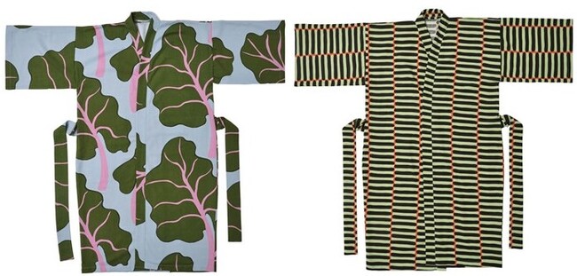 青々としたルバーブの葉、もしくはカラフルなストライプで体を包みましょう! サウナやシャワーから出たときに羽織るのにぴったり。綿/リヨセル混紡の生地は水分を吸収し、心地よい肌ざわりです。ループ状のベルト通しが付き機能性も抜群です。サイズ:S/M、L/XLの2サイズ展開