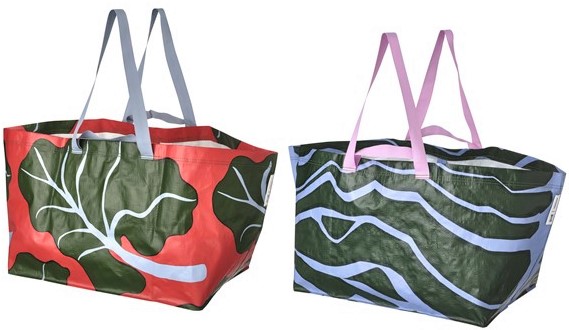 イケアの代表的なバッグに大胆なルバーブの葉とフィンランドのサウナ小屋の建材によく使われているカットされた丸太からインスピレーションを受けた個性的なパターンが登場。開口部はスナップボタン付きストラップで留められるので、バッグの両側面が広がるのを防げます。買い物や洗濯、旅行、引っ越しなど、いろんな場面で活躍する大容量で丈夫なキャリーバッグです。