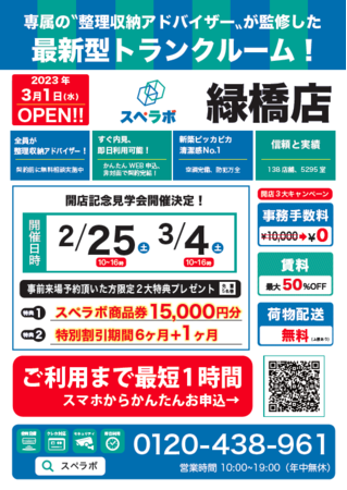 【緑橋店/3月1日(水)オープン】見学から契約、解約まで完全非接触・非対面、お申し込みからご利用まで最短1時間!都内、大阪などにて絶賛運営中のトランクルーム【スペラボ】が緑橋駅近くに出店!
