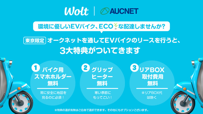 Wolt Japan株式会社(本社:東京都渋谷区、代表:野地春菜、以下 Wolt)は、情報流通支援サービスの株式会社オークネット(本社:東京都港区、代表取締役会長CEO:藤崎 清孝、代表取締役社長COO:藤崎 慎一郎、以下:オークネット)とWoltの配達パートナーに向けて、電動ビジネスバイクのリース販売を2023年1月19日から開始いたしました。