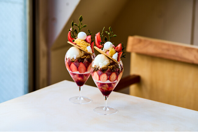 今回は旬の苺を中心に、王道のショートケーキから意外性のある苺の水羊羹やマリネなど、24種のパーツで仕上げた新感覚の苺パフェを提供いたします。