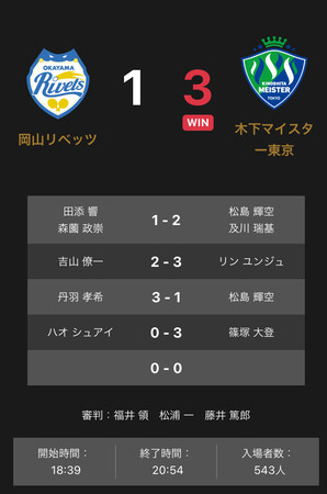 ノジマTリーグ 2022-2023シーズン 公式戦 2月22日開催 岡山リベッツvs 木下マイスター東京は、3-1で木下マイスター東京が勝利しました。