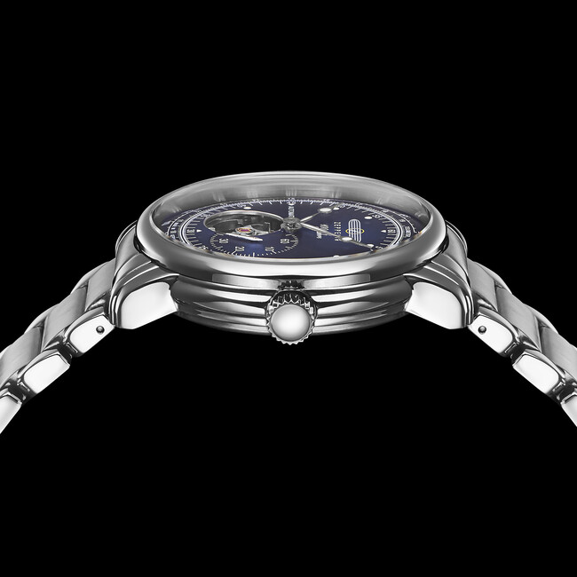 文字盤のブルーは、飛行船グラーフ・ツェッペリン号世界一周旅の窓から見た、広くて深い日本の海をイメージ。