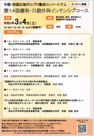【岡山大学】中国・四国広域がんプロ養成コンソーシアム「第14回歯科・口腔外科インテンシブコース」〔3/4土, オンライン開催〕