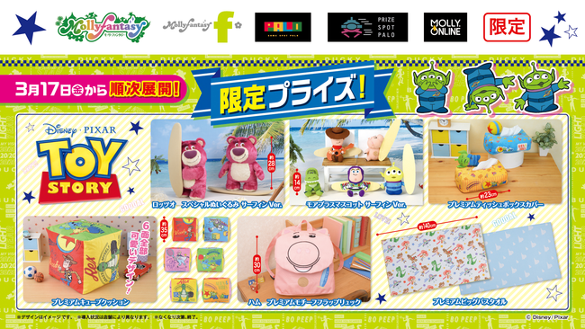 株式会社イオンファンタジー(本社:千葉県千葉市、代表取締役社長:藤原徳也、以下、当社)は、ディズニー&ピクサー作品のCGアニメ『トイ・ストーリー』の当社限定プライズゲーム用景品6アイテムを「モーリーファンタジー」「PALO」をはじめとするアミューズメント施設、オンラインクレーンゲーム「モーリーオンライン」において3月17日(金)より順次展開いたします。