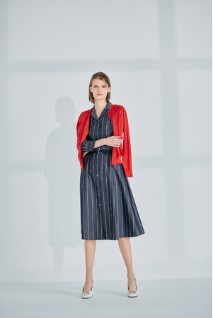 スペインの高級ファブリックメーカーのコットンを使用したスキャパらしいストライプのドレスをメインにコーディネート。インポート素材ならではのなめらかな風合いや軽やかな着心地が特徴のネイビーのドレスと赤のカーディガンでトラッドを意識したスタイルを提案いたします。
