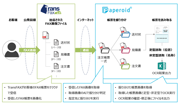 「FAX受発注業務DXサービス」は、1時間当たり数千枚のFAX送受信可能なトランザクト社の「TransFax」とTISの「Paperoid(R)」の「帳票振り分けAIサービス」と「帳票読み取りAIサービス」を組み合わせたクラウドサービスです。FAXで受信した帳票をクラウドからダウンロード、もしくは帳票画像を添付メールで受信するなどデジタル化できるため、自社でのFAXシステムの運用が不要となり、出社の必要もなくなるなど業務のデジタルトランスフォーメーションが可能です。また、FAX受信後の帳票を、お客様別・種類別に振分け、多種多様なフォーマットに沿い順番の変更を伴ったテキスト化や出力ができるため、後続の基幹・会計システムにインポートするデータ加工までを自動化できます。