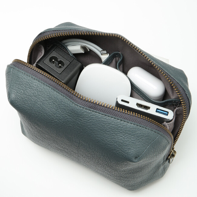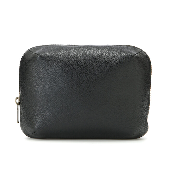 4cmのマチ幅を持ち、内側には大小のポケットを備えた、機能性の高いポーチです。シンプルながら、アクセントとして四隅をつまんだコロンとしたデザインに、職人技が光ります。