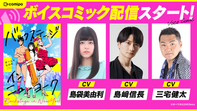 紙書籍の『バックステージ・イン・ニューヨーク』各コミックス購入者は封入の「しおり」に記載のコードを介して、電子コミックアプリ「comipo」上でボイスコミックも無償でお楽しみいただけます。