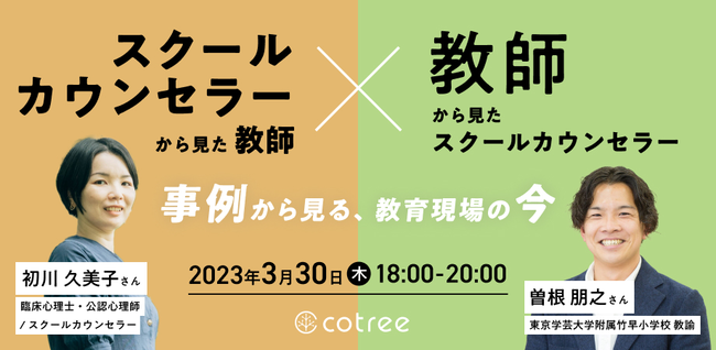 オンラインカウンセリング・コーチングの「cotree」を展開する株式会社cotree(本社:東京都港区、代表取締役:西岡 恵子、以下cotree)は、2023年3月30日(木)に「スクールカウンセラーから見た教師×教師からスクールカウンセラー セミナー」を開催することをお知らせいたします。