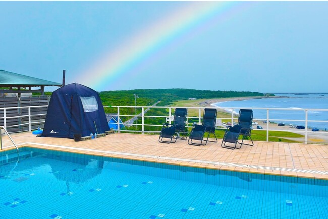 銚子市の有名観光エリア犬吠埼にある人気ホテル「絶景の宿 犬吠埼ホテル」のプールサイドでは、テントサウナ体験を実施しています。
