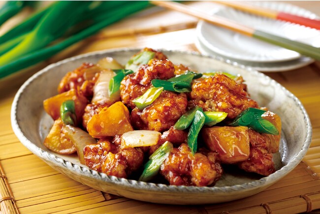 ひと口サイズの鶏肉や九条ねぎやジャガイモを甘辛タレで和えました。