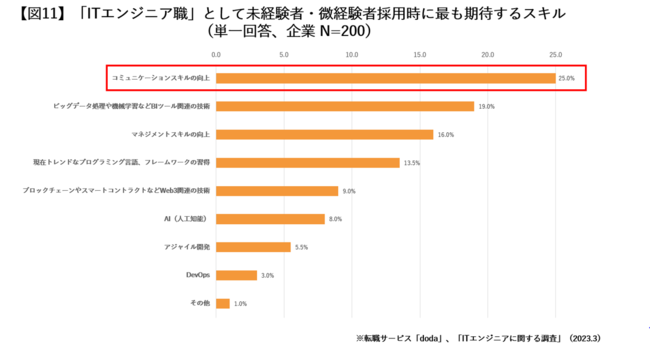 さらに未経験者・微経験者には「ITエンジニア職」に応募する際に企業が最も求めそうなスキル、企業には未経験・微経験者に実際に最も求めるスキルを尋ねたところ、未経験者・微経験者ともに一番多かったのは「現在トレンドなプログラミング言語、フレームワークの習得(未経験者 24.7%、微経験者 16.9%)」で、それ以降も技術的なスキルが上位となる中で、企業は「コミュ二ケーションスキルの向上(25.0%)」がTOPとなり異なる結果になりました(【図10】・【図11】参照)。