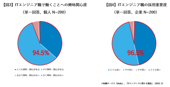 個人・企業ともに9割以上がITエンジニア職への就労・採用に「興味あり」・「重要」と回答