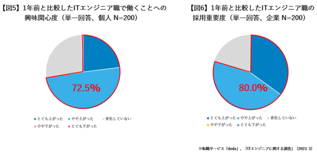 さらに1年前と比べて「興味度や重要性が上がった」と回答したのは、個人72.5%、企業80.0%という結果になりました(【図5】【図6】参照)。その際、冒頭の図1で示したITエンジニア職の転職求人倍率の上昇を裏付けるように、企業は採用の重要度が下がったという回答は0%となりました。