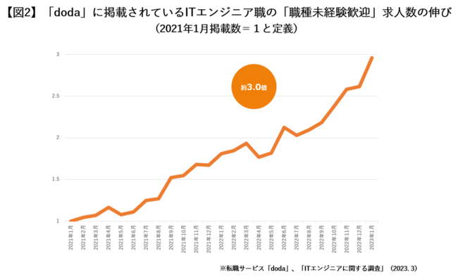 一方で、転職サービス「doda」が扱う約17万件※4の求人票を確認したところ、ITエンジニア職「未経験歓迎」求人※5の割合が2021年1月から約3.0倍(2023年1月時点)の伸長を見せていることも確認できました(【図2】参照)。ITエンジニアとしての経験がない又は軽微な人材への注目が高まっている表れともいえます。