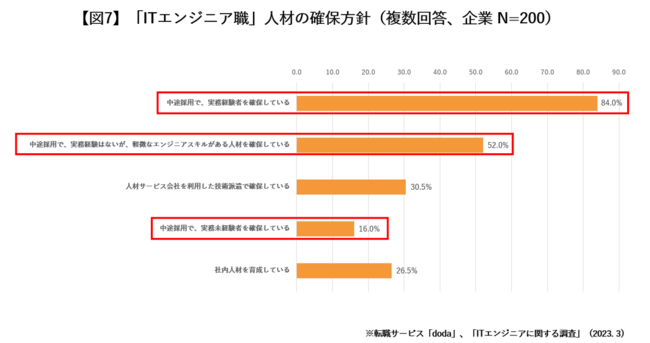 さらに企業へは、採用での獲得が難しくなる中で現状の「ITエンジニア職」をどのように確保しているのかを尋ねたところ、「実務経験者の採用」が8割以上(84.0%)と他より圧倒的に多いことが分かりました。一方で、「実務経験者」に次いで「微経験者の採用(52.0%)」が続き、「未経験者の採用」も16.0%に上っています。冒頭の図2で示したITエンジニア職の未経験歓迎求人数の伸び(2021年1月対比で約3.0倍)と同様に、未経験者・微経験者にも採用が広がっていると推測できます(【図2】【図7】参照)。