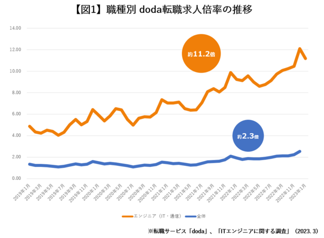 ITエンジニア職についてdoda転職求人倍率※3を確認したところ、全職種の転職求人倍率が約2.3倍であることに対しITエンジニア職にあたる「エンジニア(IT・通信)」は約11.2倍と大きく超え(2023年1月時点)、需給バランスに偏りがみられました(【図1】参照)。新型コロナウイルス感染症を一因として起きた産業構造の変化から業界を限らず様々なモノ・サービスのデジタル化やDX化が進んでいることで、それらを推進させられる人材へのニーズが高まり続けるという事象が起きているといえます。