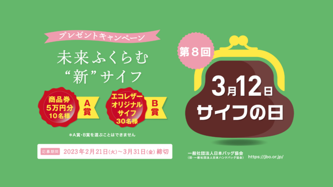 一般社団法人日本バッグ協会の主催により、3月12日の 『サイフの日』 を記念し、アンケートにご協力いただきました方の中から抽選で豪華賞品が当たるプレゼントキャンペーンを本年も開催しております!