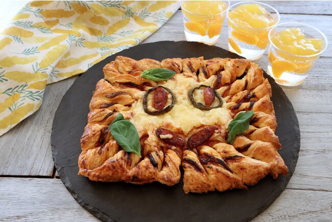 ソースと具材とクリームチーズをパイシートでサンドし、かわいく形を整えて焼き上げます。一緒に作るのは、しゅわしゅわ炭酸とオレンジジュースの二層のゼリーです。