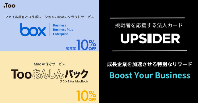 今回の優待プログラムの提供により、法人カード「UPSIDER」を利用する企業の方はファイル共有とコラボレーションのためのクラウドサービス「Box Business/Box Business Plus/Box Enterprise」を初年度10%割引で、Macの保守サービス「TooあんしんパックプランS for MacBook」を10%割引でご利用いただくことができます。