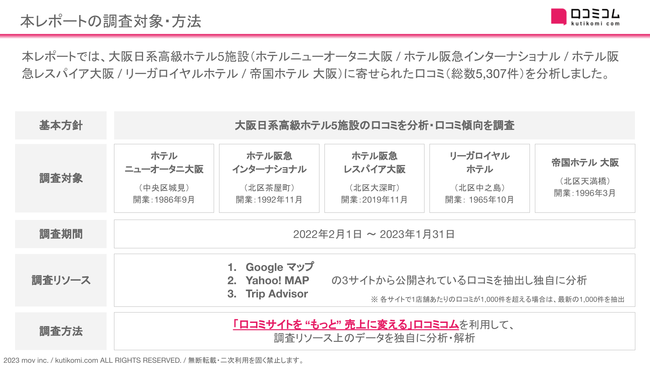 レポートをくわしく見る(無料)→ https://academy.kutikomi.com/whitepapers/202303_japaneseluxuryhotel-osaka/?utm_source=pressrelease&utm_medium=prtimes&utm_campaign=202303_japaneseluxuryhotel-osaka■ 本レポートの調査対象