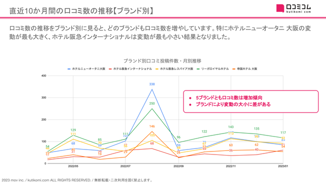 本レポートでは、大阪日系高級ホテル5施設(ホテルニューオータニ大阪 / ホテル阪急インターナショナル / ホテル阪急レスパイア大阪 / リーガロイヤルホテル / 帝国ホテル 大阪)に寄せられた口コミ(総数5,307件)を分析しました。レポートをくわしく見る(無料)→ https://academy.kutikomi.com/whitepapers/202303_japaneseluxuryhotel-osaka/?utm_source=pressrelease&utm_medium=prtimes&utm_campaign=202303_japaneseluxuryhotel-osaka■ 施設別に口コミ投稿の月別推移を見てみると...