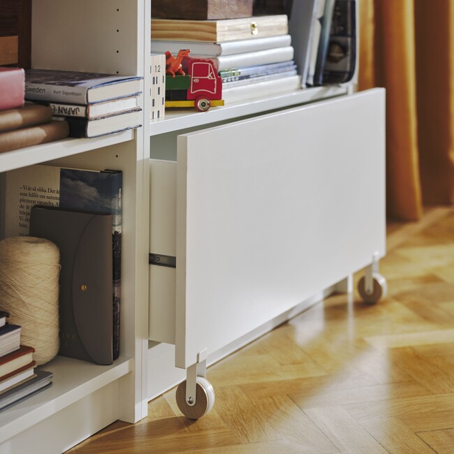 世界中のどこかのイケア店舗で5秒に1台のペースで売れている、イケアでもロングセラーの人気商品。棚板の位置を自分好みに変えたり、棚板を増やしたりできるので、必要な収納を自分らしくカスタマイズできます。扉をつければ、まとまりなく見えがちな本棚をすっきり見せることができるので、お部屋に統一感も生まれます。一番下の段に引き出しキャスター付きを加えれば、腰を曲げずに取り出しやすく、隠す収納としても重宝します。