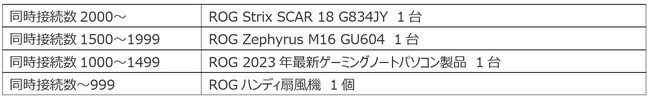 ゲーム対戦の16:00~17:00の1時間にライブ配信の最大「同時接続数」に応じて、ROGの最新製品をプレゼント