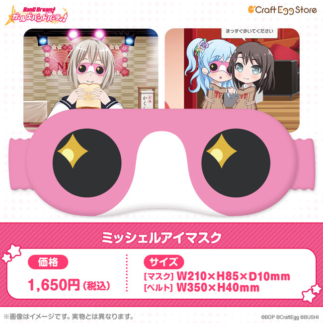 ゲーム内に登場した「ミッシェルアイマスク」がグッズとして登場いたします。柔らかいクッション性のある生地を採用し、実用性にもこだわったアイテムです。日常生活のなかでメンバーとのお揃いを楽しんでいただけます。
