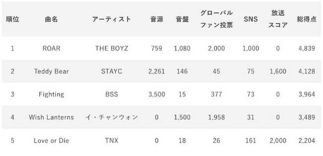 (※)各スコアの割合音源35%、音盤15%、グローバルファン投票(アプリ)20%、SNS10%、放送スコア20%
