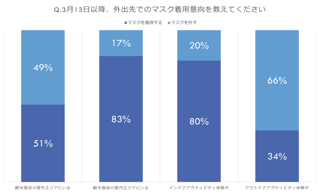 ・観光施設、屋内外問わず「マスク着用する」派多数。アウトドアアクティビティのみ、「マスク外す」が「マスク着用する」を上回る結果に。