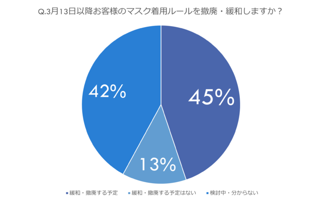 ・約半数が「3月13日以降にお客様のマスク着用ルールを緩和する」と回答。うち7割が、屋内外を問わずマスク着用を個人の判断に委ねると回答。