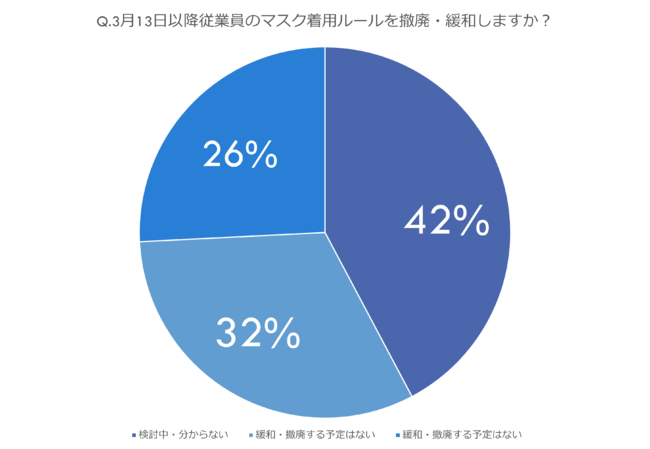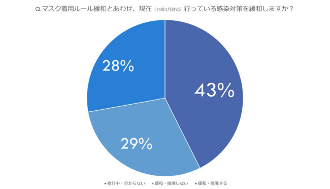 調査時点(2月時点)で行っていた感染対策の緩和については、「分からない・検討中」が43%と最多。「緩和・撤廃をする」「緩和・撤廃をしない」の回答はそれぞれ約3割弱を占め、方針が分かれる結果となりました。