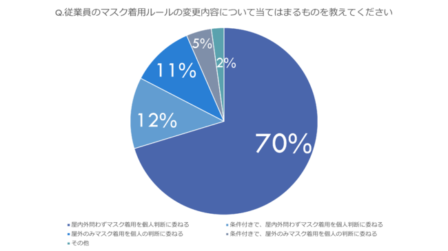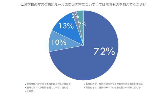 ・約半数が「お客様のマスク着用ルールを緩和する」と回答。うち7割が、屋内外を問わずマスク着用を個人の判断に委ねると回答。
