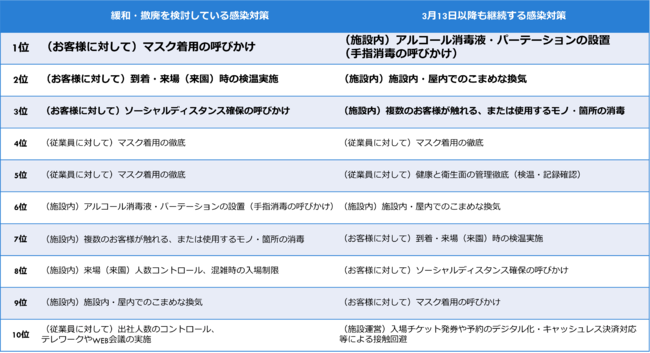 観光地では3月13日以降、お客様に対するマスク着用の呼びかけは緩和・撤廃が進む見込みです。しかし、春休みやゴールデンウィークを控える現段階では、従業員のマスク着用やその他感染対策の緩和は「予定していない」「検討中」の回答を挙げる事業者が7割以上を占めており、慎重な姿勢であることが伺えます。脱マスクにあわせ、お客様に協力を促すような「検温」「ソーシャルディスタンス確保の呼びかけ」は緩和・撤廃の傾向にありながら、事業者努力による「消毒液・パーテーションの設置」「換気実施」等は継続傾向にあり、ここにも事業者のコロナ感染リスクに対する慎重な姿勢が表れていると考えられます。