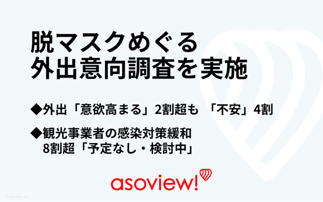 アソビュー株式会社(所在地:東京都品川区、代表執行役員CEO:山野智久、以下、当社)は、新型コロナウイルス対策のマスク着用を3月13日(月)より屋内外を問わず個人の判断に委ねる政府の方針を受け、アソビュー!会員 6,902名に対して調査を実施いたしました。春休みシーズンとともに到来する「脱マスク」と、生活者の外出意向に関する調査結果を発表いたします。