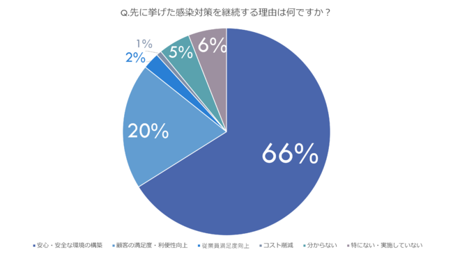 緩和・撤廃する項目としては、先に挙げた「マスクの着用推奨・徹底(ゲスト、従業員ともに)」「検温の実施」「ソーシャルディスタンス確保の呼びかけ」が上位となり、一方「アルコール消毒液・パーテーションの設置(手指消毒の呼びかけ)」「換気の実施」「共用部(モノ・箇所)の消毒」は引き続き継続する項目として挙げられました。これらを継続する理由は「安心・安全な環境の提供」の回答が6割以上を占め、安心して遊べる環境の提供をしたいという事業者の意図が分かりました。