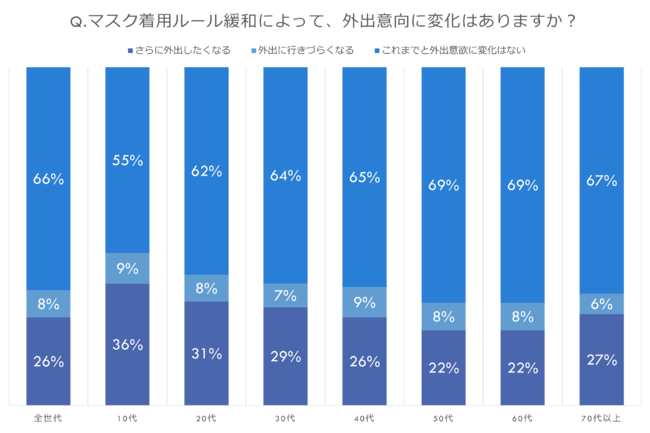 マスク着用ルールの緩和によって「外出・お出かけの意向に変化があるか」の問いに対して「変化がない」との回答が66%を占め、26%が「さらに外出したくなる」と答えました。世代別では、特に10代が「さらに外出したくなる」と答える傾向、50代・60代が「外出意欲に変化はない」と回答する傾向が他世代より高いことが分かりました。