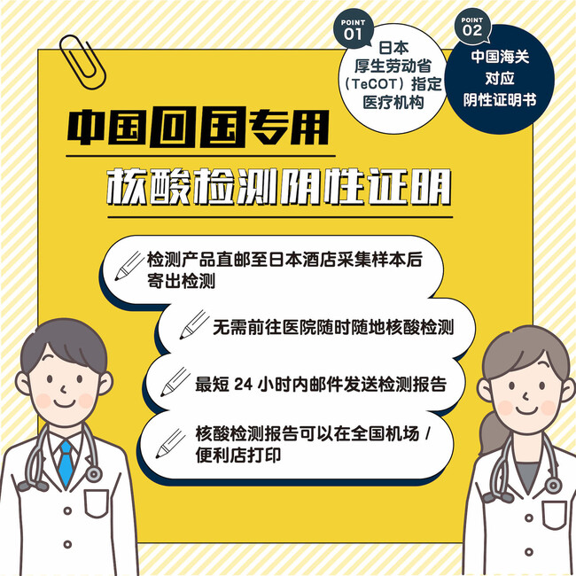 - 【6930円~来院不要】中国渡航用証明書発行サービス(大使館公認)10%OFFのお知らせ【6930円~无需前往医院】中国回国用核酸检测证明书发行服务 (大使馆公认) 10%优惠活动02/28 12:19