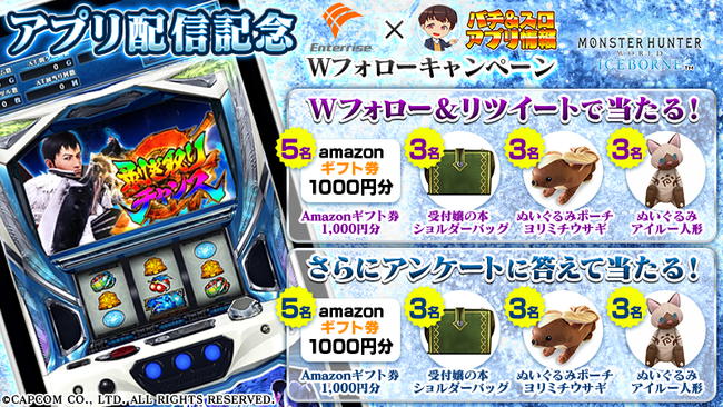 アプリの配信を記念して、「モンスターハンターグッズ」「Amazonギフトカード」が当たるTwitterキャンペーンを実施いたします。