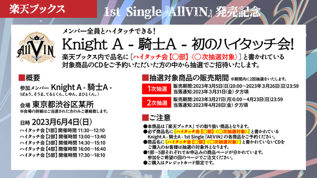 参加をご希望のお客様は、楽天ブックスで、必ず商品名に[ハイタッチ会【◯部】〈 ◯次抽選対象〉]と書かれているKnight A - 騎士A - 1st Single「AllVIN」の各商品をご予約ください。